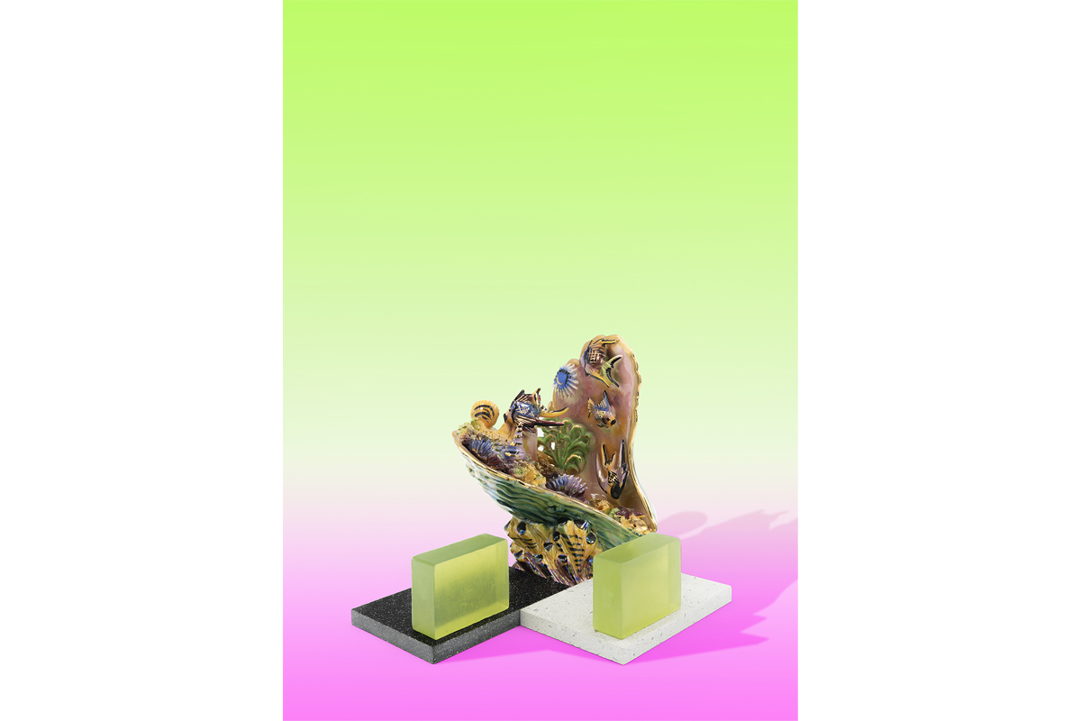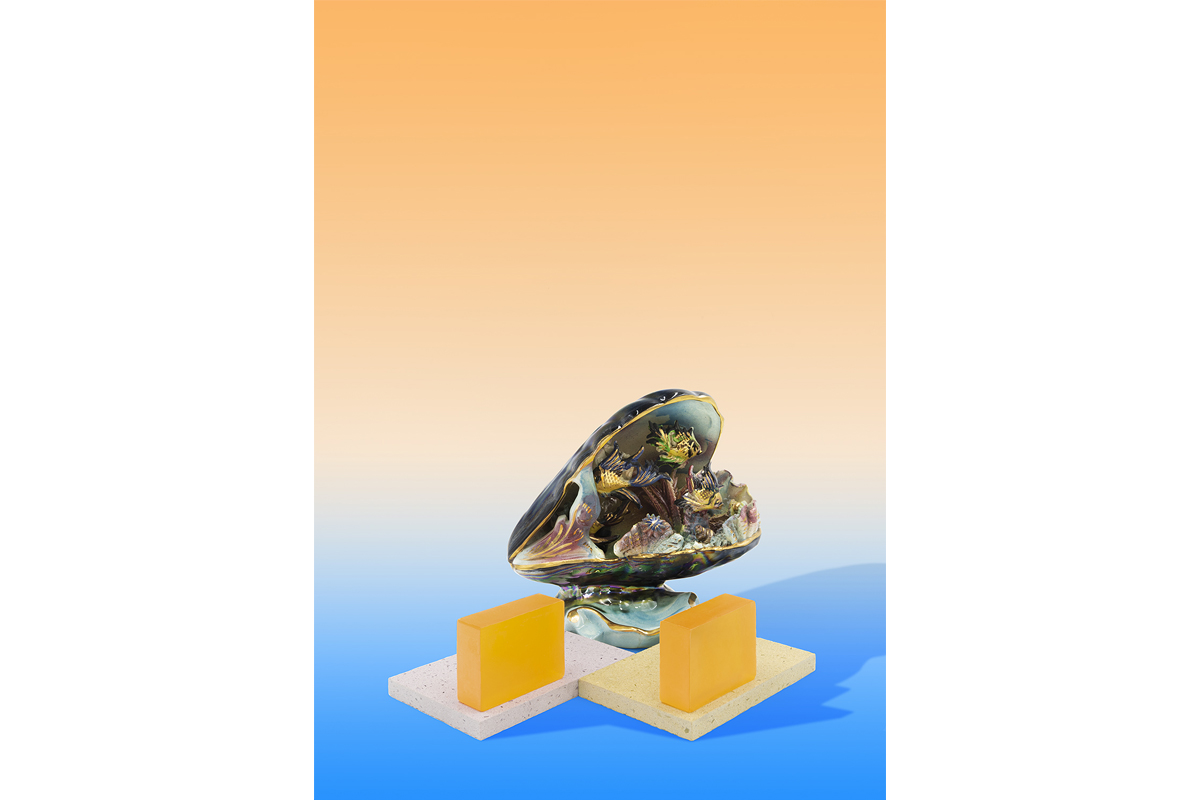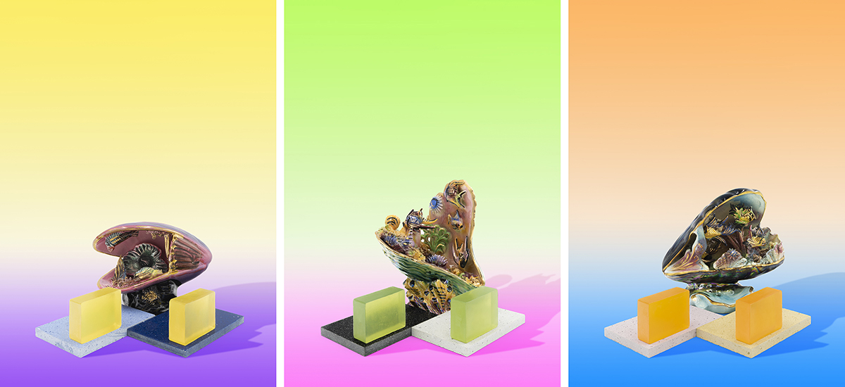 El jabón, elemento indispensable de la higiene personal, se relaciona en esta serie con las lámparas coquillages estilo Vallauris, unos objetos decorativos de los años 60-70 del siglo XX que imitaban fondos marinos. El resultado es una fantasía acuática de aspecto kitch que invita a un relajante y divertido baño.