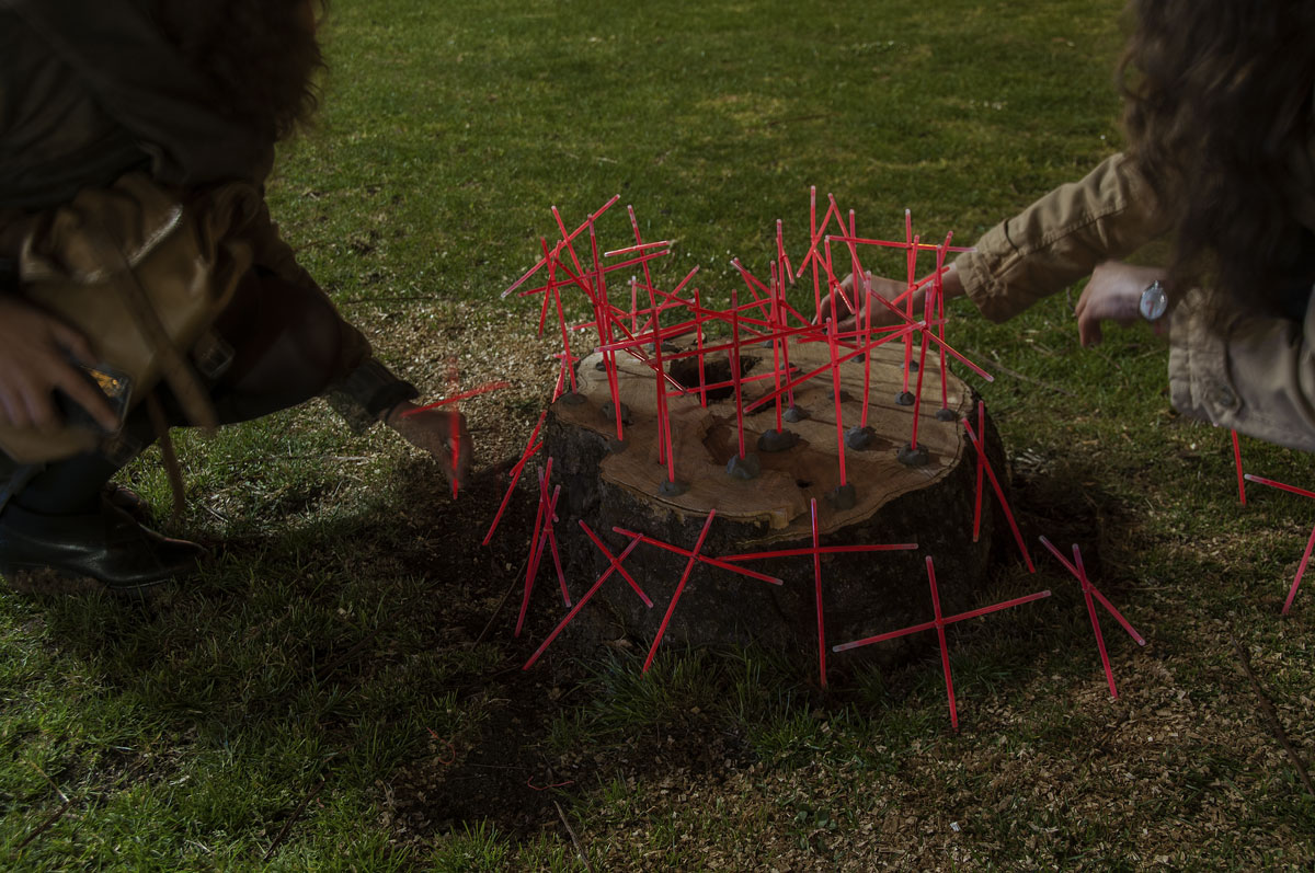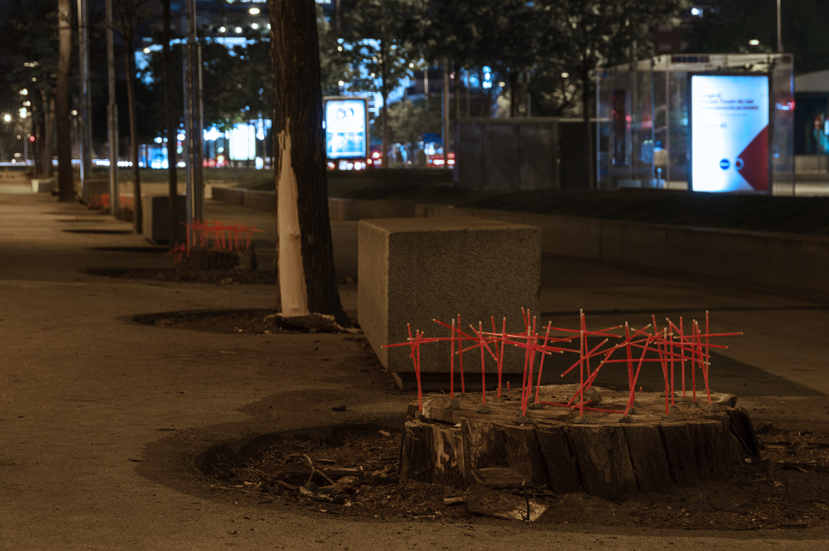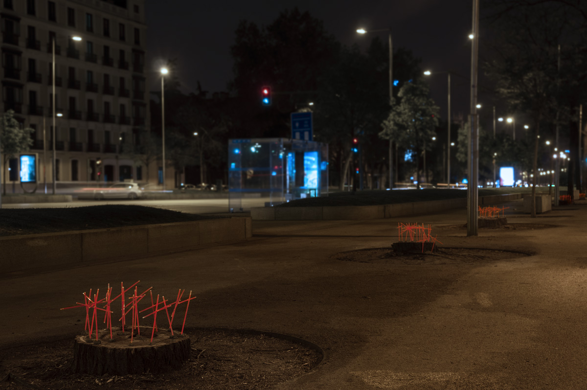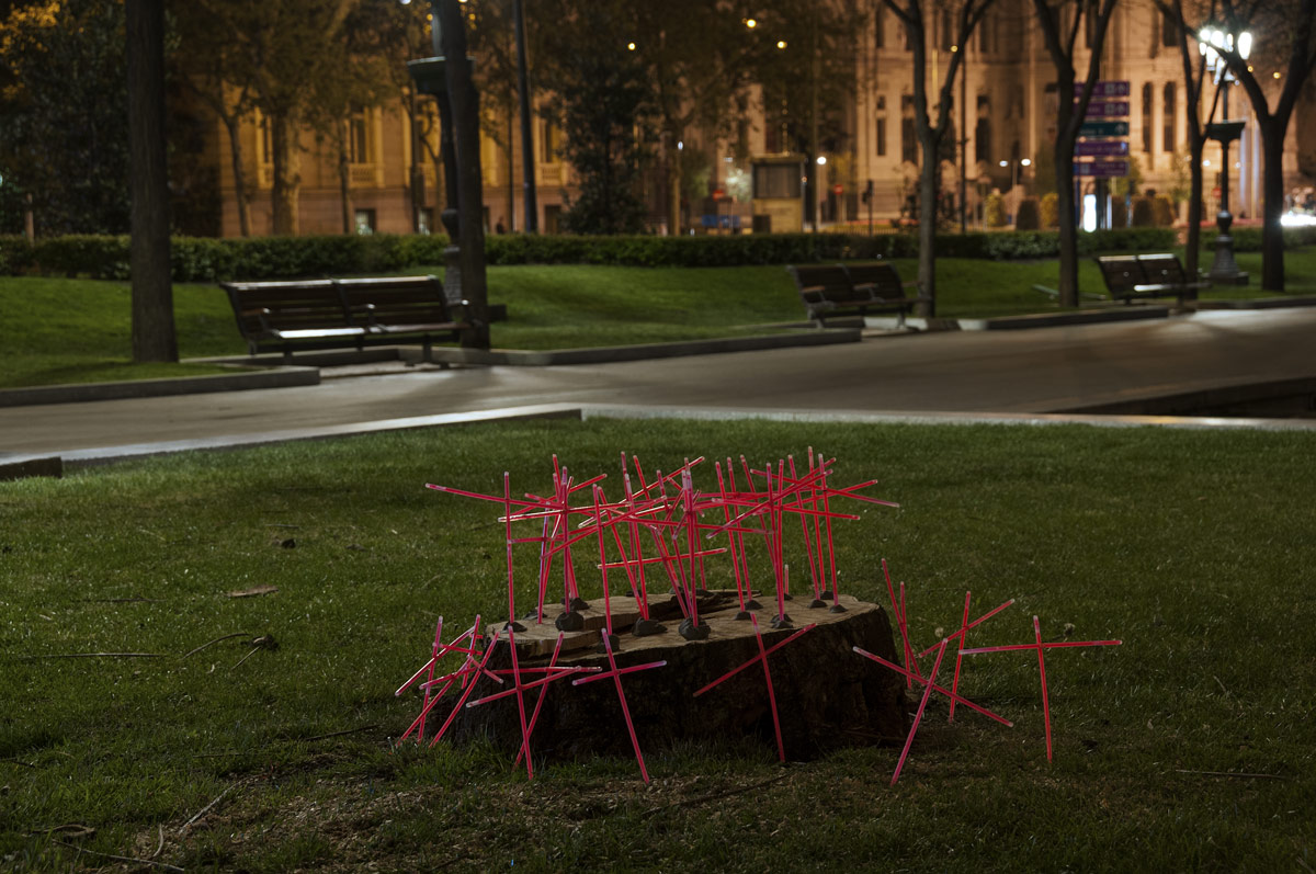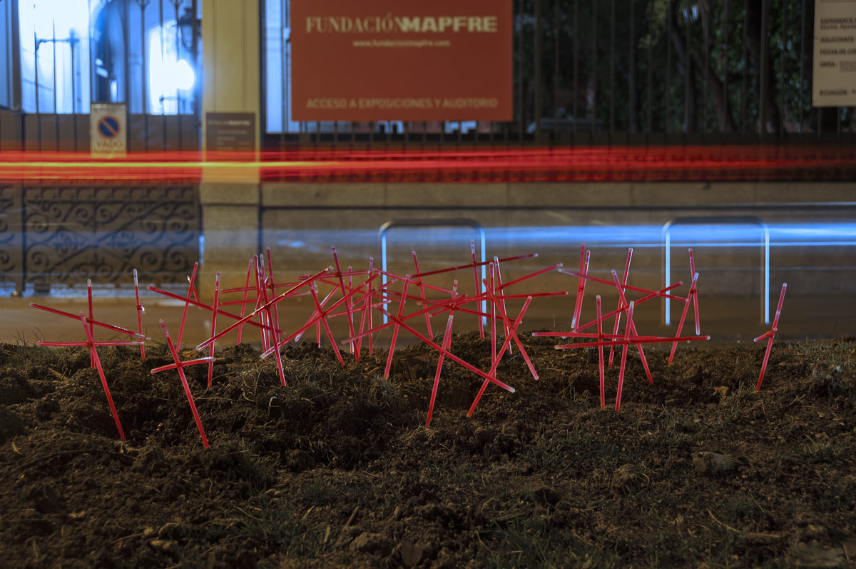 Documentación fotográfica de la acción "Red Crosses on a Green Graveyard / Cruces rojas sobre cementerio verde", llevada a cabo por el colectivo Luzinterruptus y realizada en el paseo de Recoletos, Madrid, en abril de 2015.