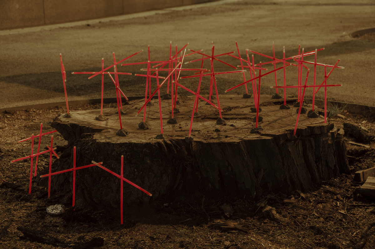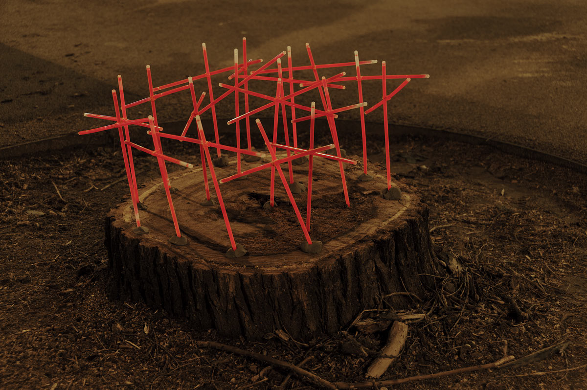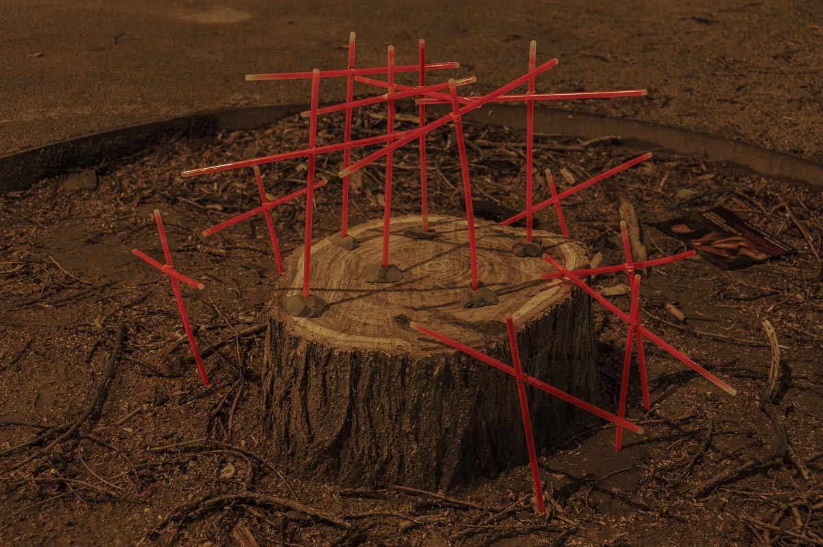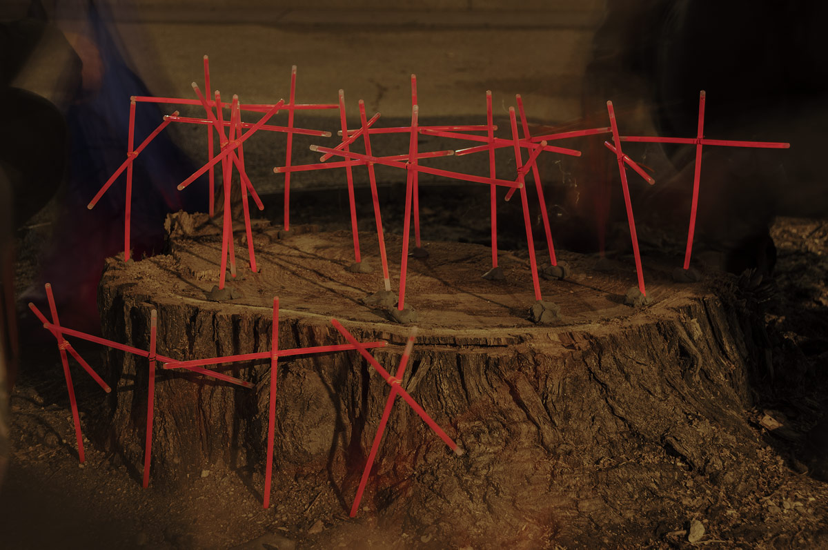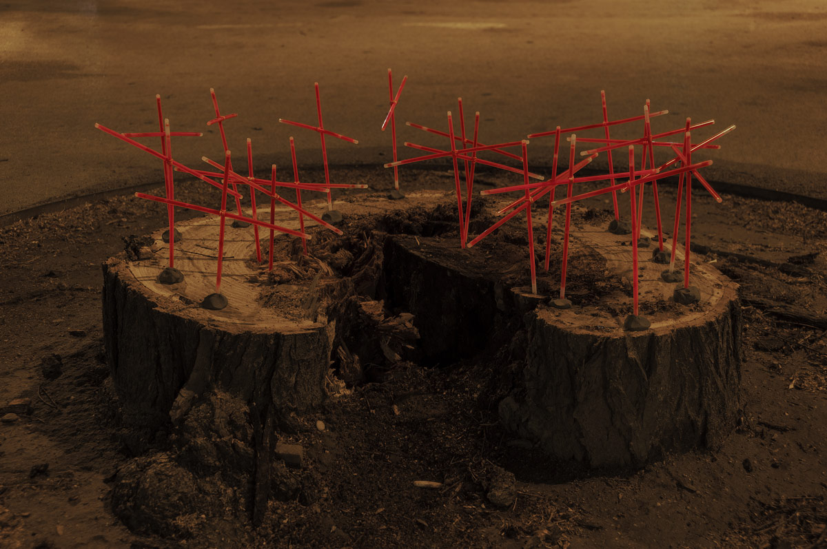Documentación fotográfica de la acción "Red Crosses on a Green Graveyard / Cruces rojas sobre cementerio verde", llevada a cabo por el colectivo Luzinterruptus y realizada en el paseo de Recoletos, Madrid, en abril de 2015.