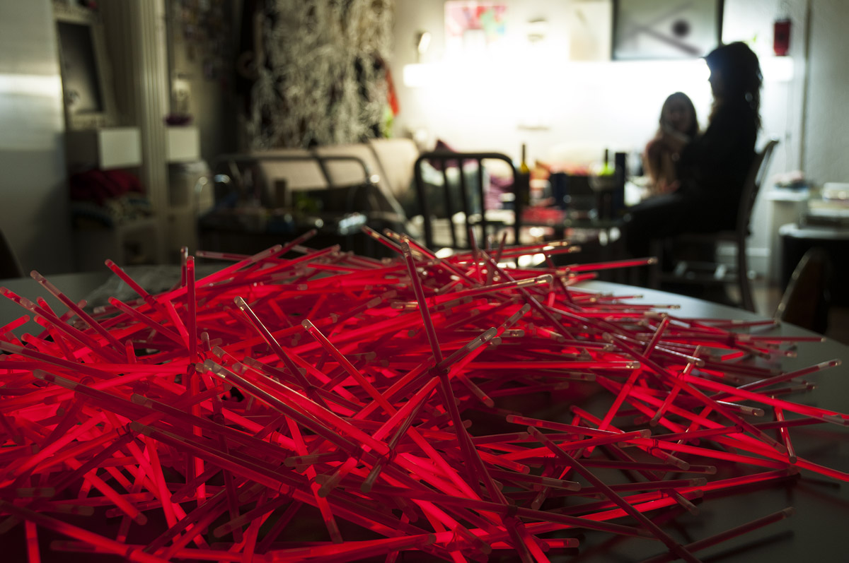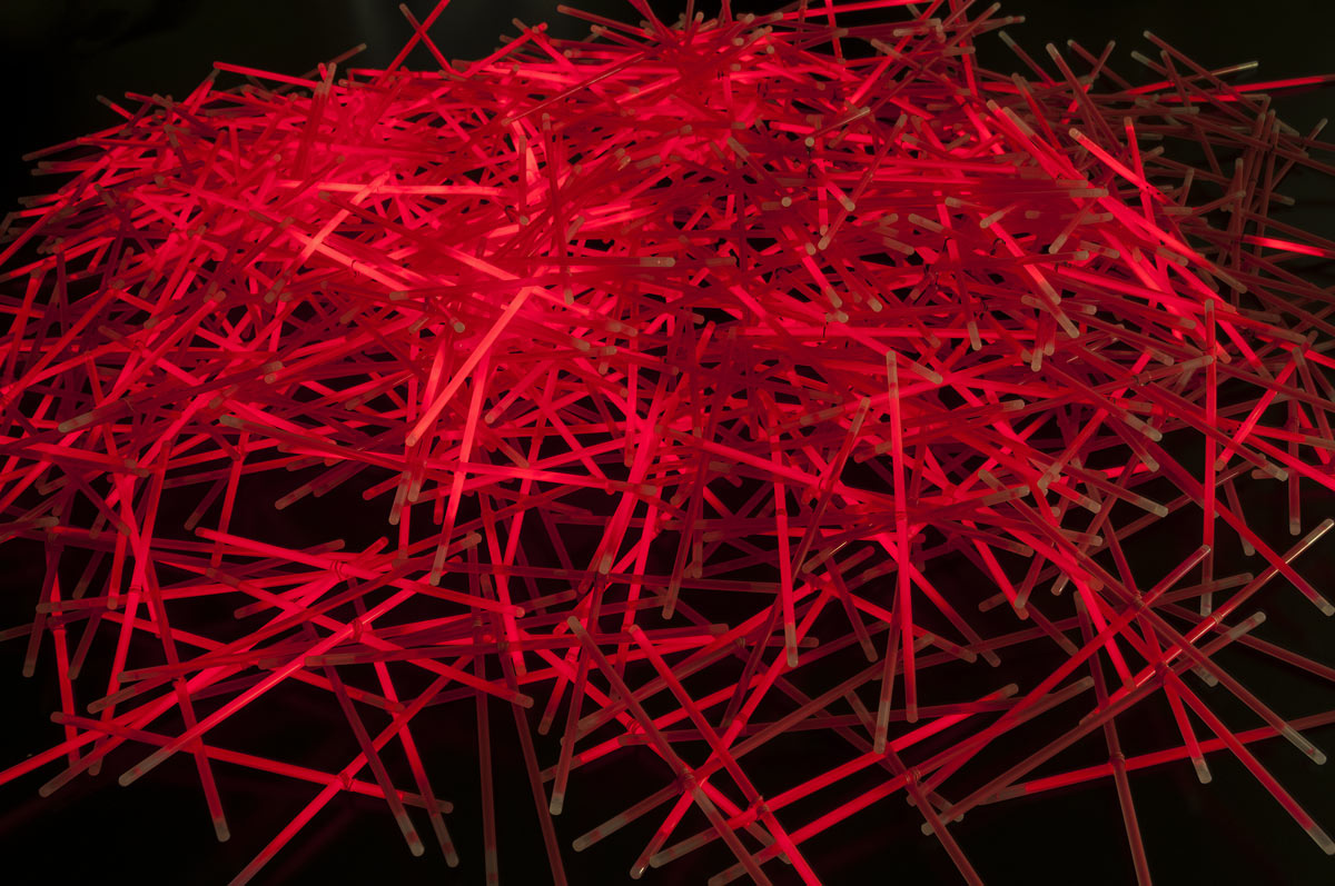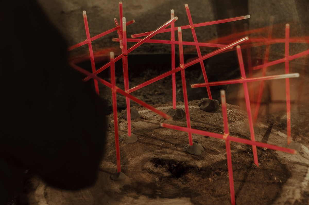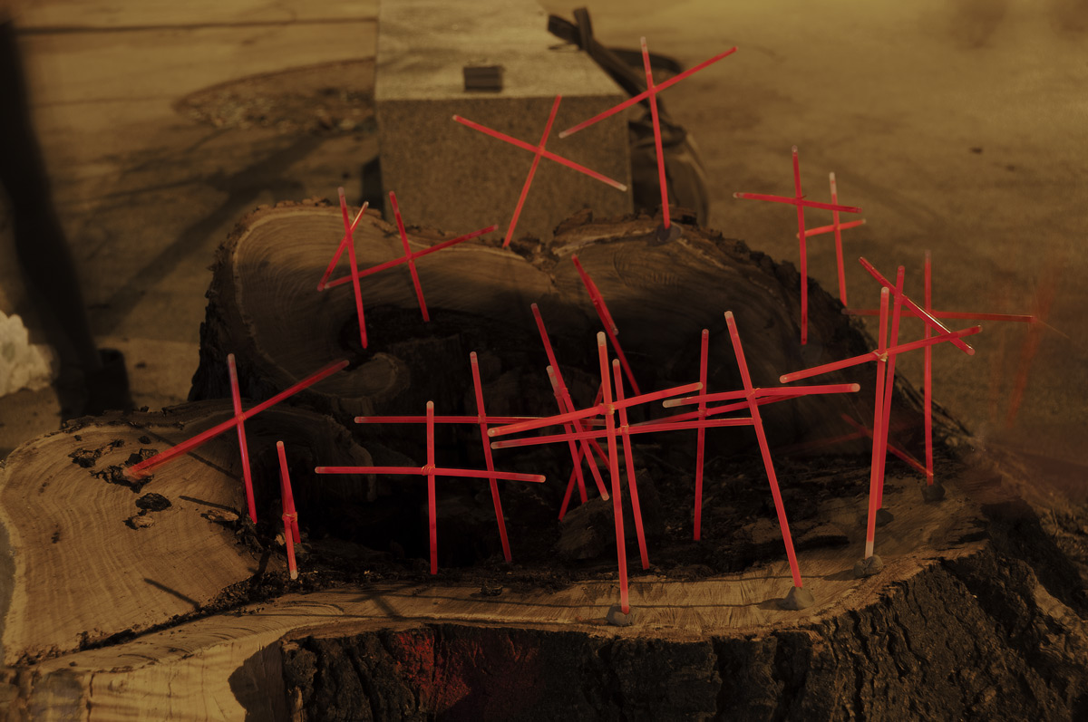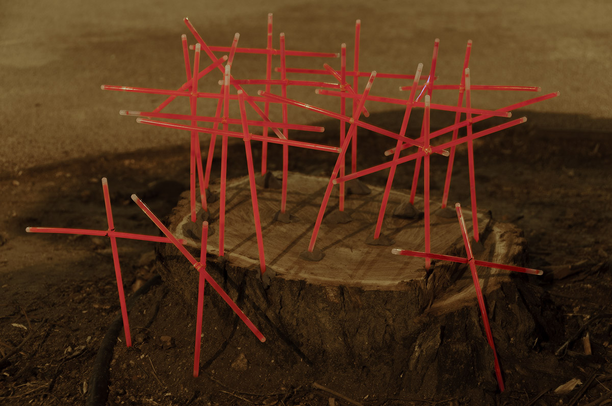 Documentación fotográfica de la acción "Red Crosses on a Green Graveyard / Cruces rojas sobre cementerio verde", llevada a cabo por el colectivo Luzinterruptus y realizada en el paseo de Recoletos, Madrid, en abril de 2015.