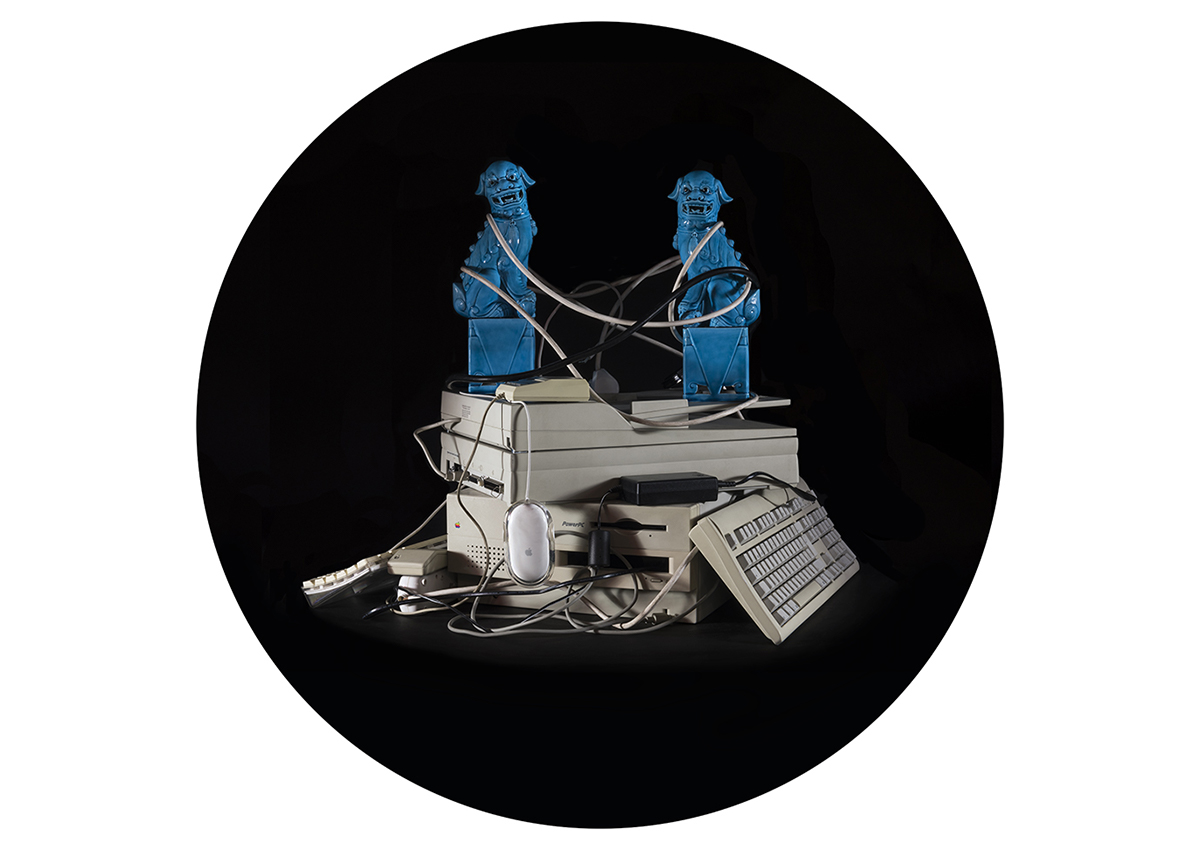 Además de la tecnología anticuada presente en estas imágenes, las tres naturalezas muertas -a modo de tríptico narrativo- se complementan con una serie de objetos que aportan significados simbólicos. En la primera imagen, la escultura “Triunfo” del artista Héctor Orruño cuestiona precisamente el paso del tiempo y la insignificancia de vivir en un mundo de transición, caballo galopante que es la muerte sobre la existencia humana. En la imagen central del tríptico, la esfinge griega interroga y predice en forma de enigma, siempre atenta a la mirada del dios Poseidón. Por último, en la tercera imagen, con mirada irónica y actitud juguetona, unos perros Foo de frágil porcelana azul protegen el lugar a la espera de buenos augurios.